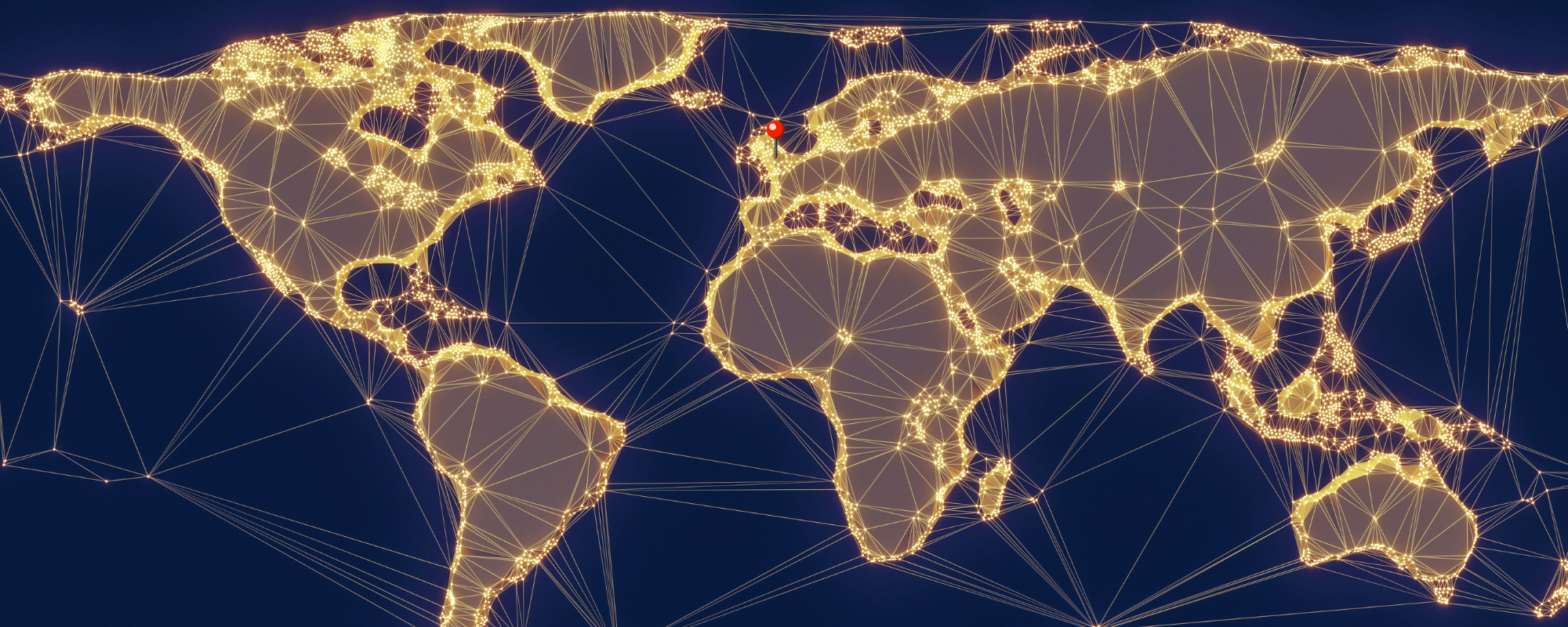 Digital world map with illuminated interconnected lines and dots on a dark background, highlighting Europe and surrounding continents.