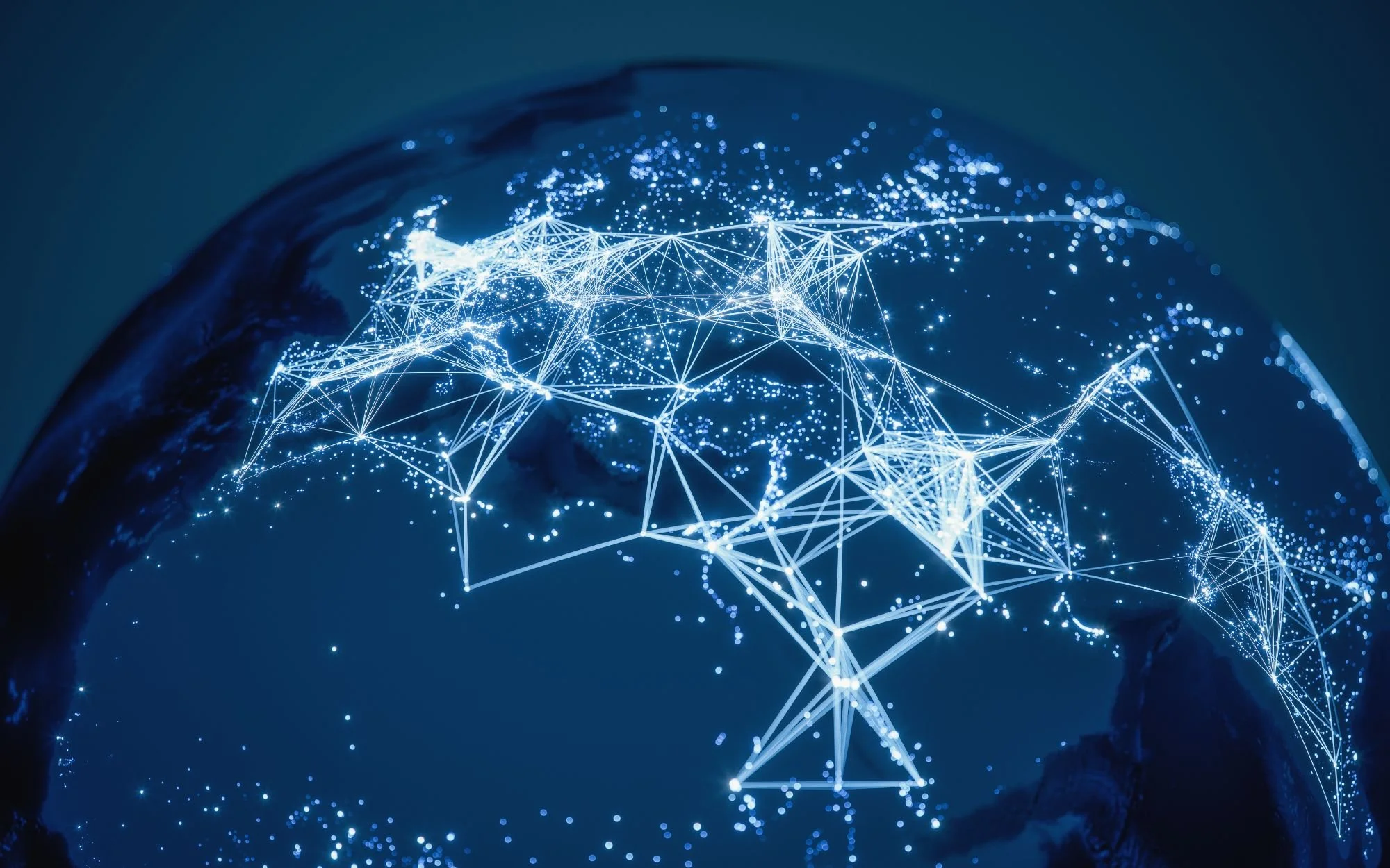 A digital illustration of the Earth with interconnected bright blue lines and points, representing a global network or digital connectivity.